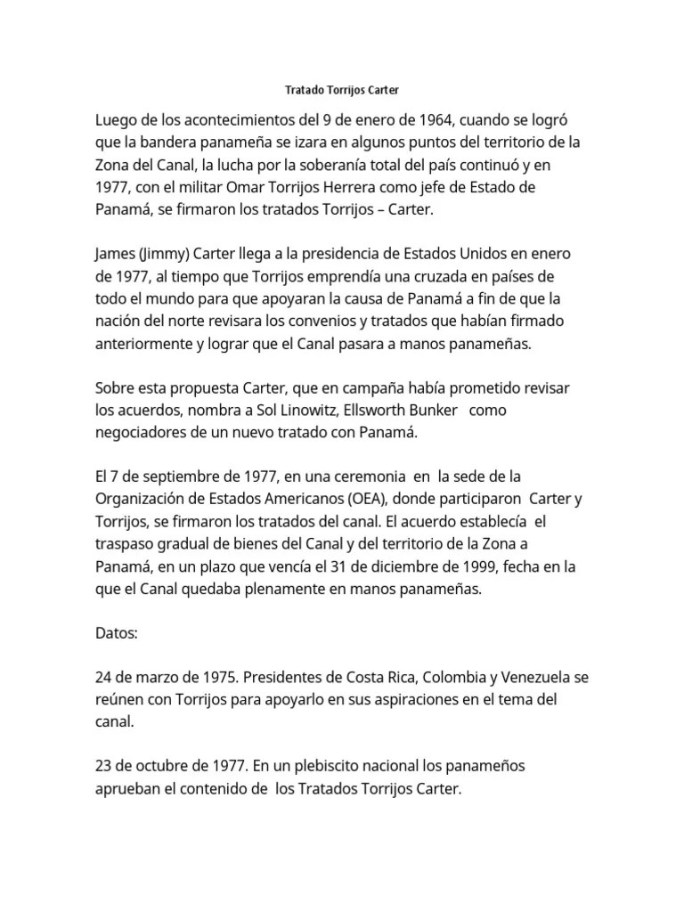 Con ellos, se pone fin a la presencia colonial estadounidense en el c. Entornointeligente.com / el presidente de la república , laurentino cortizo , a través de cuenta de twitter, se unió a la celebración de los 42 años de la firma de los tratados torrijos. El 7 de septiembre de 1977, en una ceremonia en la sede de la organización de estados americanos (oea), donde participaron carter y torrijos, se firmaron los tratados del canal. El acuerdo establecía el traspaso gradual de bienes del canal y del territorio de la zona a panamá, en un plazo que vencía el 31 de diciembre de 1999, fecha en la. torrijos negoció los tratados del canal de panamá con estados unidos (e.u.).